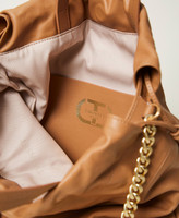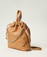 Shopper bag made in Italy from soft natural calf nappa leather with light grain, demi-matt texture. Drawstring closure, double leather on-shoulder handle, removable and adjustable shoulder strap, metal chain handle, heat-printed gold-tone lettering logo, lining.