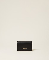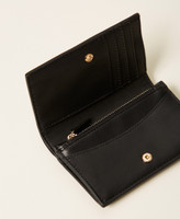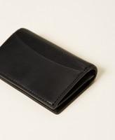 Medium smooth faux calfskin leather wallet with metal lettering logo. Bifold with functional internal compartments and a flat external pocket.