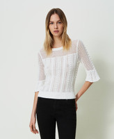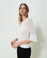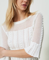 Cotton jumper with mixed stitch work and cable knit, crew neck, flared three-quarter sleeves, blousing hem with ribbed finish.
