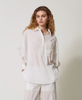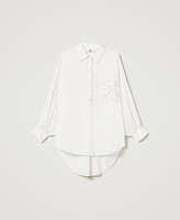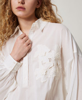 Blouse in cotton muslin with appliquéd embroidered fabric flowers for a pocket effect. Featuring logoed button fastening, long sleeves with dropped shoulders, buttoned cuffs, side slits, a rounded asymmetric hem, yoke and box pleat on the back, a heart-shaped logo in gold-tone metal on the back and an oversized fit.