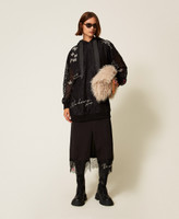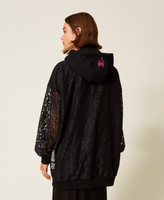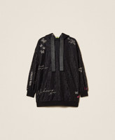 Maxi sweatshirt designed by artist Myfo for the Actitude collection, made from macramé lace with contrasting yarn embroidery. Adjustable jersey hood with shiny gros-grain drawstring, long sleeves, lined bodice, loose fit.