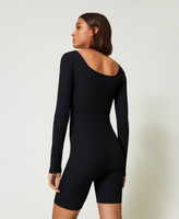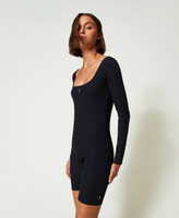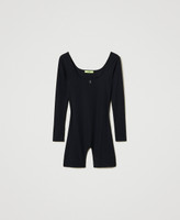 Limited edition short jumpsuit designed by artist Myfo for the Actitude collection. Made from ribbed stretch technical fabric, wide neckline on the front and back, long sleeves, cycling-style shorts, elastic with contrasting embossed logo at the back, fitted.