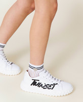 Fishnet socks with stripes and logo plate appliquéd on the side.