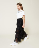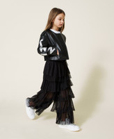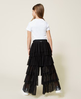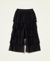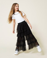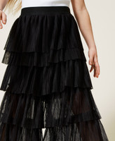 Pleated tulle trousers wide fit trousers with gathered flounces, and contrasting elastic at the waist.