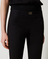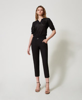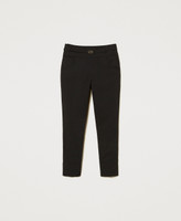 Trousers in cotton poplin with a matching belt with metal Oval T buckle. Featuring belt loops, a midriff band at the hips, front pockets, side zip fastening, bottom slits and a fitted shape.