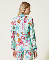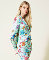 Viscose satin blazer with print, lapels, padded shoulders, buttons, flap pockets.