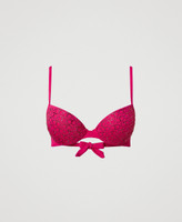 Padded push-up bikini top with non-removable cups, appliquéd rhinestones with Oval T graphics, lace-up closure.