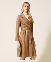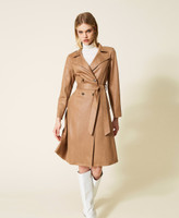 Raw cut trench made from slanted scuba with suede-like effect, double-breasted closure with buttons, no lining.