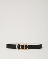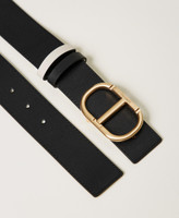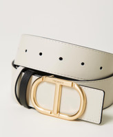 Reversible low waist leather belt with removable gold-toned Oval T buckle, two-tone belt loops.