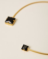 Brass choker necklace with rhinestones and engraved logo. The metal is flexible for easy wear.