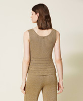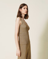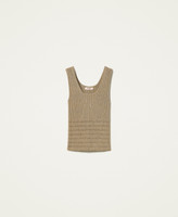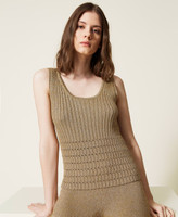 Ribbed lurex knit top, fitted, with round neck and openwork at the hem.
