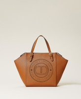 Trapezium-shaped shopper with lasered openwork logo, side zip and magnet closure, double handle.