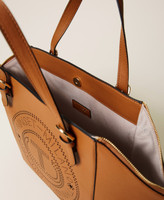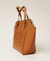 Complete your look with this trapezium-shaped shopper decorated with lasered openwork logo. Made of natural fine grain material with side zips and magnet closure, double handle with buckle. A perfect tote bag for everyday use, will add a personalised touch to every outfit.