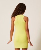 Girls' plain knit viscose short dress with round neck, faux pockets with flaps and metal logo buttons, fitted.