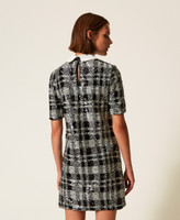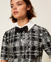 Actitude collection full sequin fabric short dress with a black and white check pattern. Removable poplin collar and bow tie, teardrop opening with button at the back, side zip fastening, short sleeves, lining, straight fit.