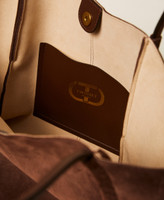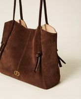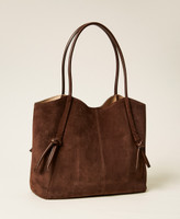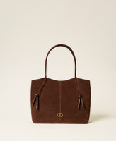 Suede split leather shopper bag with matching full grain calfskin leather handles and bottom. Magnet closure, double tubular shoulder strap and metal Oval T logo on the front panel. Microfibre interior with pocket. Perfect for everyday and for the office.