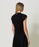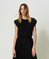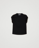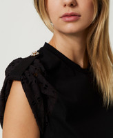 Crew neck jersey t-shirt with poplin short sleeves with broderie anglaise and frog fasteners with jewel buttons on the shoulder.
