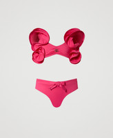 Bikini top with double ruffle on the shoulder straps and slight gathering on the front, bottom with bow on the front.