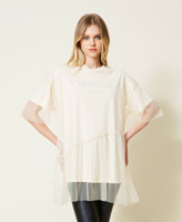 See-through effects for this cotton jersey t-shirt with crystals embroidered all over and refracting the light, contrasting logo, doubled with tulle and with flounce at the hem. A style statement you can match with jeans or classic trousers, depending on the occasion.