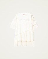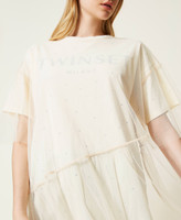 Cotton jersey t-shirt doubled with tulle, with crystal embroidery all over, logo and flounce.