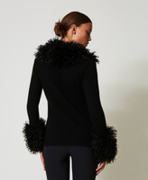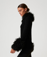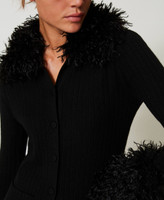 Wool blend ribbed cardigan. Removable faux fur neck and cuffs, round neck, covered button fastening, long sleeves, appliqué pockets, fitted.