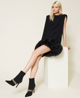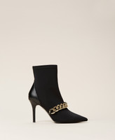 Technical fabric ankle boots with snug pointy design and tall, thin heels. Gold tone chain, inner zip closure and tunit sole. Noon to night, with wide trousers or knit dresses.