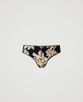 Brazilian bikini bottom with floral print and contrasting embroidered trim. Solid colour lining and heart-shaped metal logo on the back.