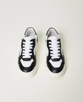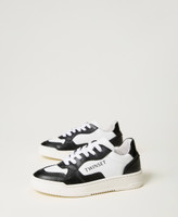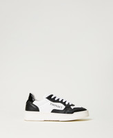 Colour block calf leather trainers with contrasting lettering logo and rubber sole.