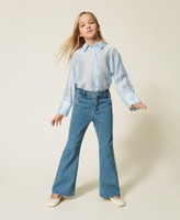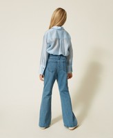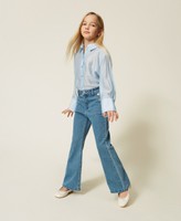 Girls’ stretch cotton jeans with light blue wash. Zip and logo snap button fastening, decorative buttons, slant pockets at the front and patch pockets on the back, flared.