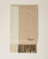 Jacquard scarf with geometric pattern, fringed hem, contrasting logo.