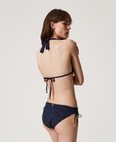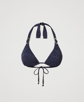 Curtain string triangle bikini top in jacquard fabric with a leaves and flowers pattern, and irregularly shaped gold-tone rings. Padded with detachable cups, it features laces that tie behind the neck or work as shoulder straps thanks to eyelets at the ends, fastening on the back with thin laces with gold-tone rings at the ends.