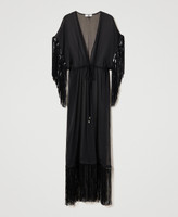 Long creponne kaftan with sequin fringe trim at the hem, drawstring at the waist, short sleeves.