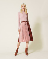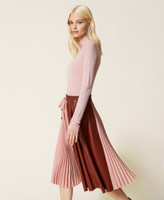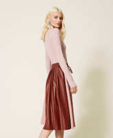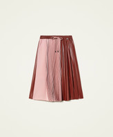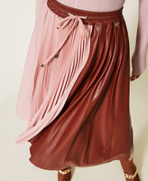 Coated fabric and crêpe de Chine midi skirt with folds and pleats front and back, drawstring at the waist.