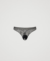 Seductive and impalpable, the tulle g-string with scalloped lace on the front and picot waistline will be a precious ally under second skin trousers and skirts, with its smooth tulle back enhanced with a romantic bow.
