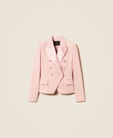 Actitude collection cady jacket with buttons covered in satin and metal logo. Double-breasted fastening with lapels and tonal satin details, long sleeves, front flap pockets, lining, fitted.