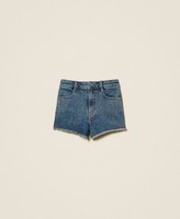 Girls’ stretch denim shorts with studs on the front and a frayed hem. Belt loops, zip and snap button fastening, five pockets, medium blue wash, straight fit.