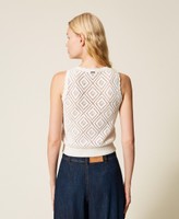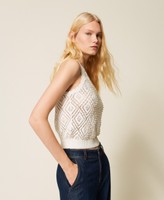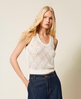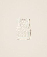 Cotton yarn top with diamond pattern openwork and pearl rivet studs. Scalloped round neck and armholes, ribbed hem, fitted.
