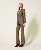Twinset revisits the houndstooth pattern in this double-breasted blazer made from Italian wool blend fabric with lurex thread adding a sparkle of light. Straight fitting, with lapels and solid colour detail, button closure, welt pockets, Oval T logo plate on the back and lining. You can also wear this blazer with its matching trousers.