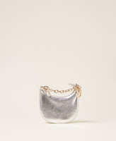 Mini Croissant bag made from faux calfskin leather with branded charm and key ring, zip closure coin pocket, and chain handle with carabiner.