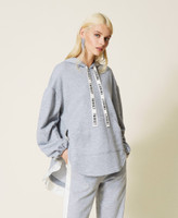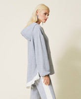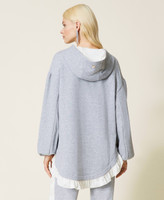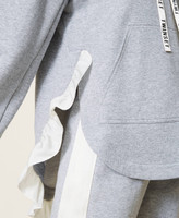 Mottled hoodie with logo ribbon on the drawstring, kangaroo pockets, satin flounce on the back.