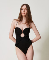 One-piece swimsuit with ruched cups and inserts and centred cut-out. Overlay on the cups, no padding, back clasp fastening, removable straps can be self tied behind the neck or turned into shoulder straps using the eyelet ends. The cups are underwired to maintain their shape and are buttoned together at the front. Side boning, high cut leg, heart-shaped metal logo on the back. Fully lined.