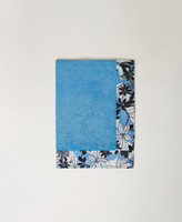 Doubled cotton terry beach towel with solid colour on the inside and tropical flower print on the edges, printed logo.