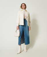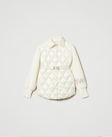 Short puffer jacket made from satin-like lightweight shiny nylon with diamond quilting. Long knit sleeves with contrasting lettering logo, shirt collar, tonal snap button fastening, elasticated belt with varnished metal Oval T buckle, rounded at the hem, straight fit.