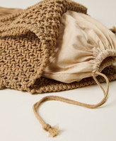 Shoulder shopping bag made of crocheted rope, with handles, side fringes, inner fabric pochette.