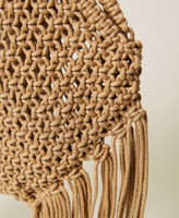 Boho-chic appeal for this shoulder tote made of hand-crocheted rope featuring handles, maxi side fringes, no lining, removable canvas pochette inside, metal heart with logo. The perfect match for a romantic long dress.
