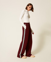 Wide scuba fabric trousers with irregular stripe side bands. Elasticated waist, side pockets, heart-shaped logo plate on the back, wide fit.