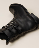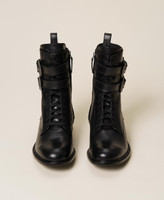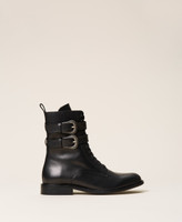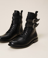Combat boots with double chiselled buckle, logo on the tab, front fastening and inner zip, leather sole.