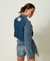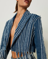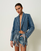 Actitude collection washed denim blazer, cropped fit, with lapels, long sleeves and appliquéd fringes.