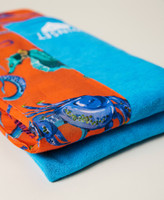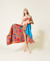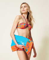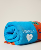 Beach towel made of printed cotton doubled with terry cloth, with logo and jacquard heart.