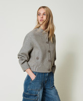 Doubled wool blend cloth bomber jacket with pin stripe pattern created with gold-tone micro sequins. Clean lines and flat seams on the inside, lapels, tonal button fastening, long sleeves pleated at the cuffs that define the design, welt pockets with buttons, Oval T logo at the back, no lining, loose fit.